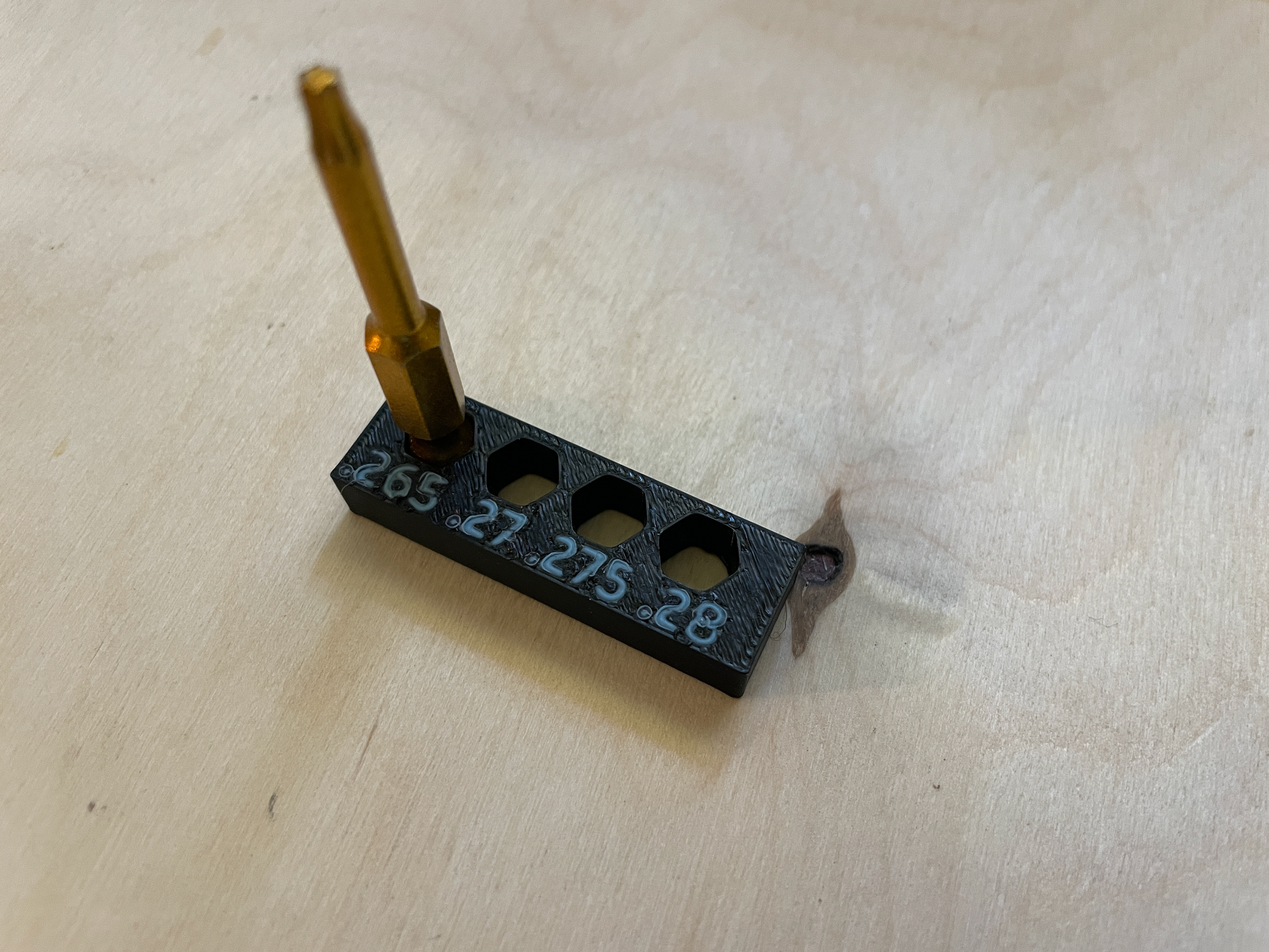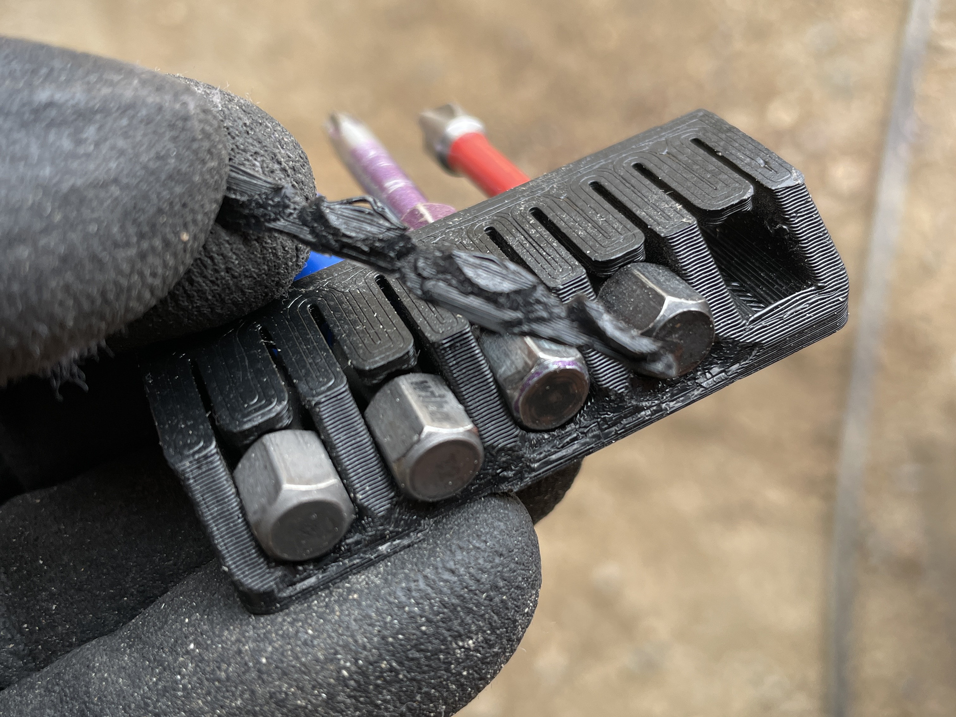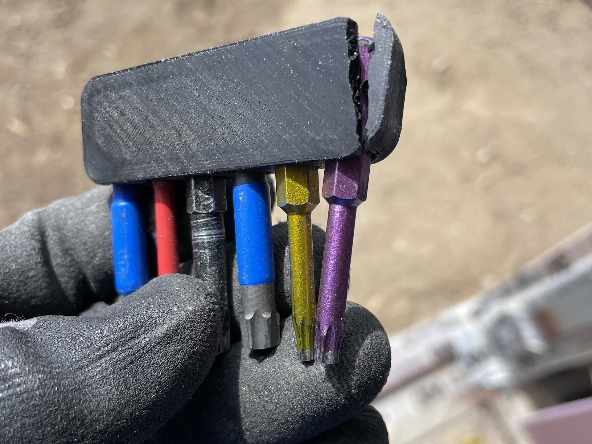 I like having quick access to the bits I most commonly use. I've used rubber bit holders and they seem either really tough to get out or too soft. I've also used designs that retain the bit with a magnet, these have the potential to collect metal fines, and it's also another component to source. I designed one version that uses magnets on the back so it can attach to a metal surface. I used this design for over a year in my previous carpentry role, and learned how the design could be improved when it would break. The leaf spring retention design has been incredibly consistent and has not shown signs of wear or loosing it's engagement.