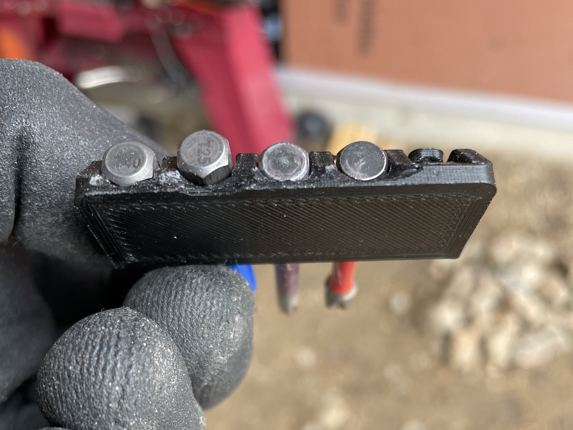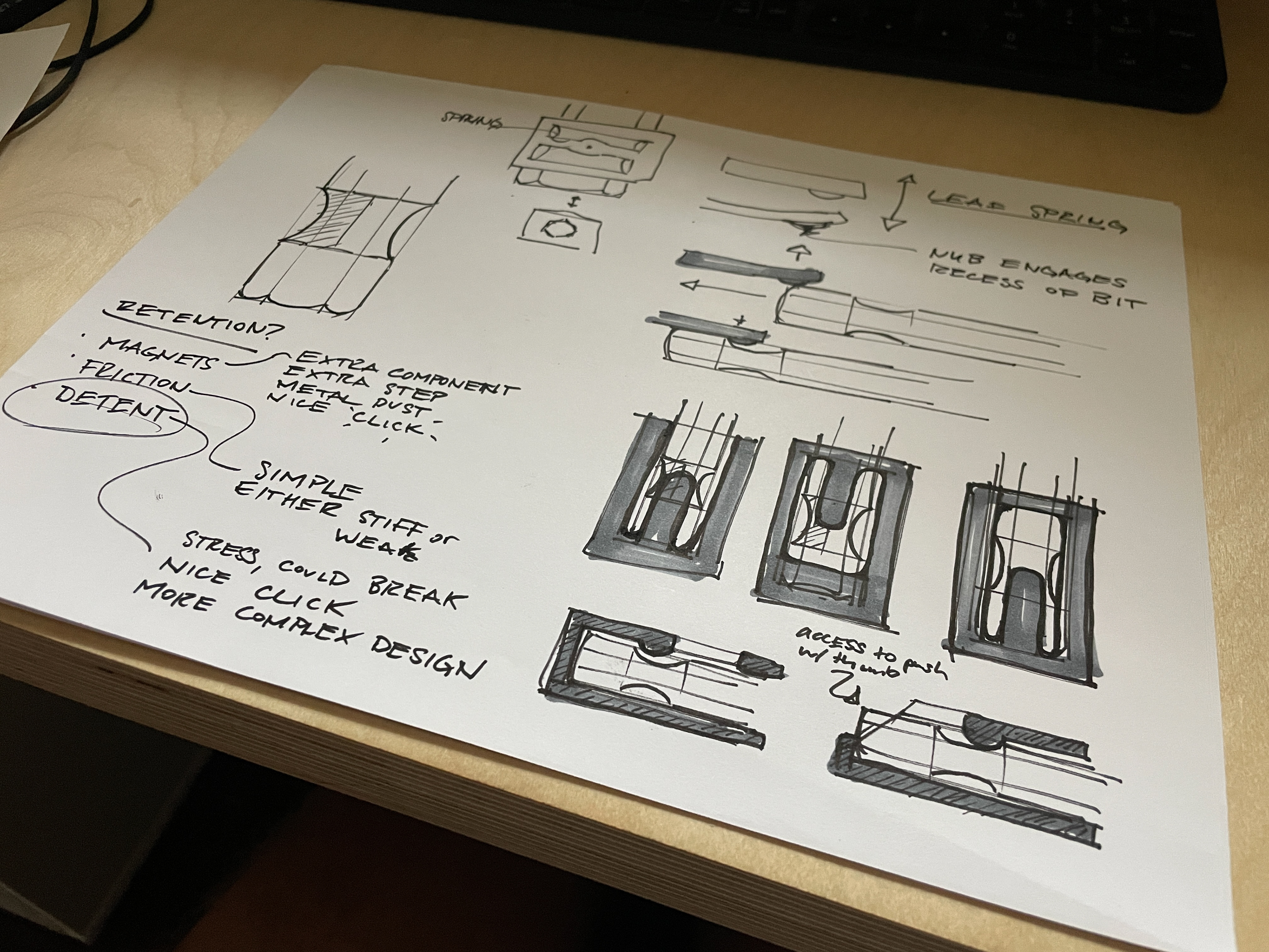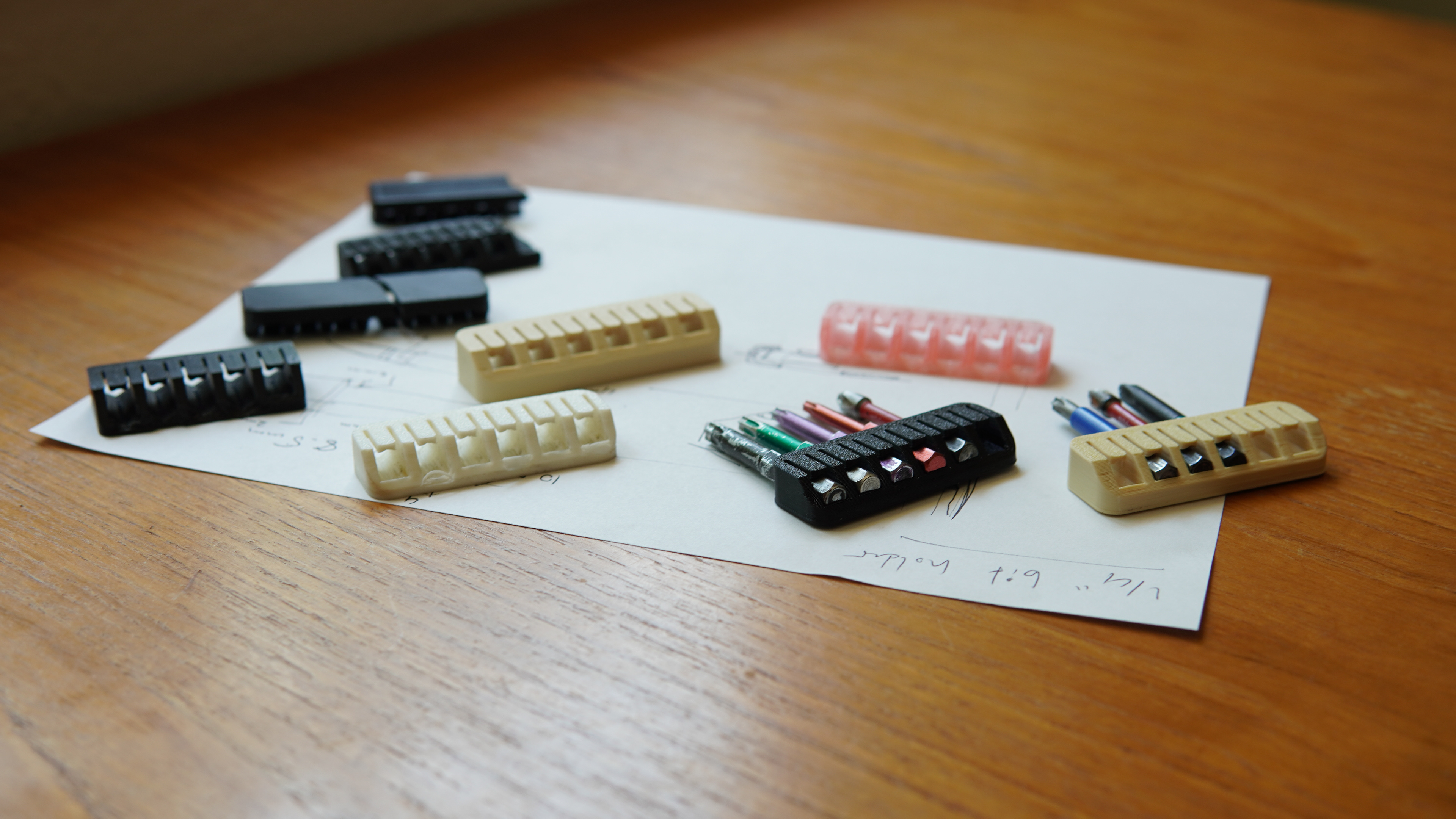 I like having quick access to the bits I most commonly use. I've used rubber bit holders and they seem either really tough to get out or too soft. I've also used designs that retain the bit with a magnet, these have the potential to collect metal fines, and it's also another component to source. I designed one version that uses magnets on the back so it can attach to a metal surface. I used this design for over a year in my previous carpentry role, and learned how the design could be improved when it would break. The leaf spring retention design has been incredibly consistent and has not shown signs of wear or loosing it's engagement.